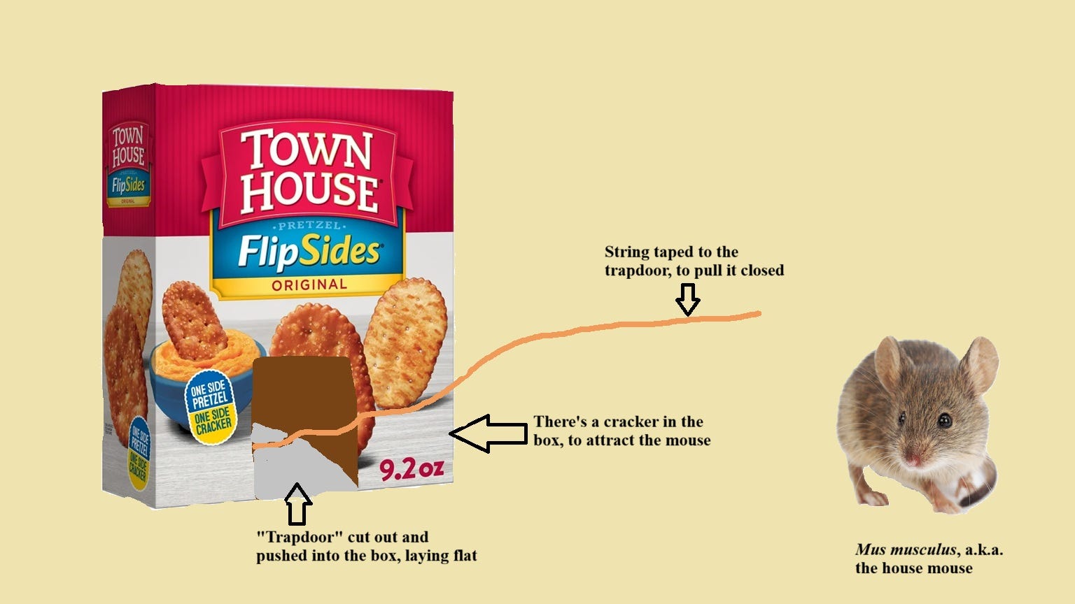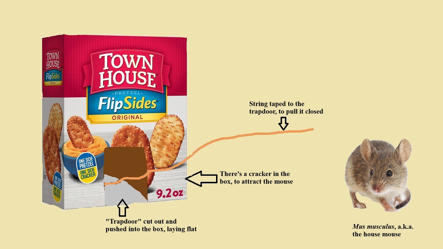 Permission to catch the mouse, granted after only a few minutes of desperate petitions, was all that I needed to enter a frenzy of scissors, glue, and string. An old box of Town House Flipside crackers (which I have not seen on shelves in many years, though the internet claims they still exist) served as the marble out of which I carved my MouseCatcher.